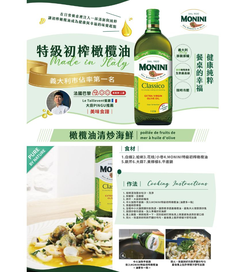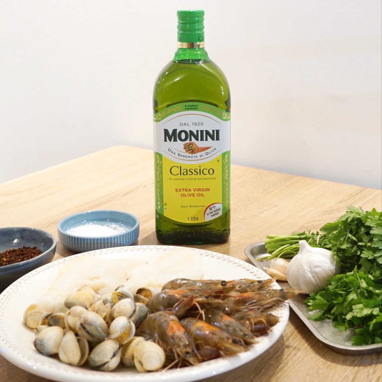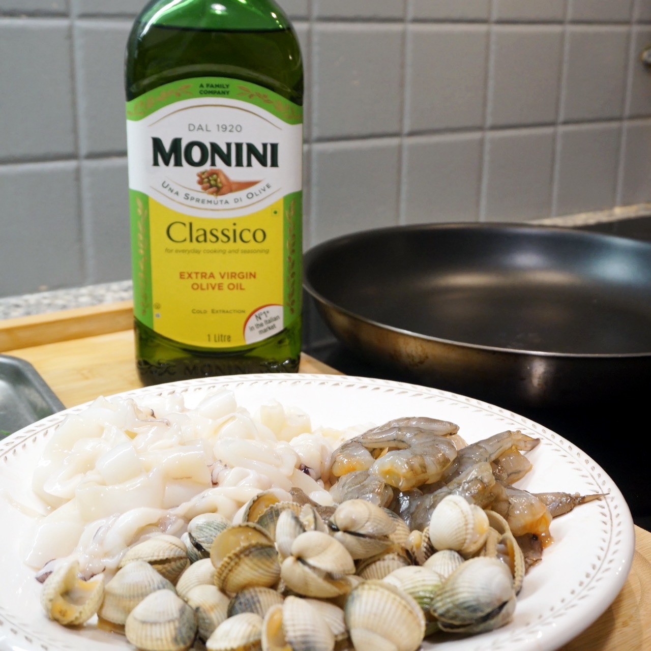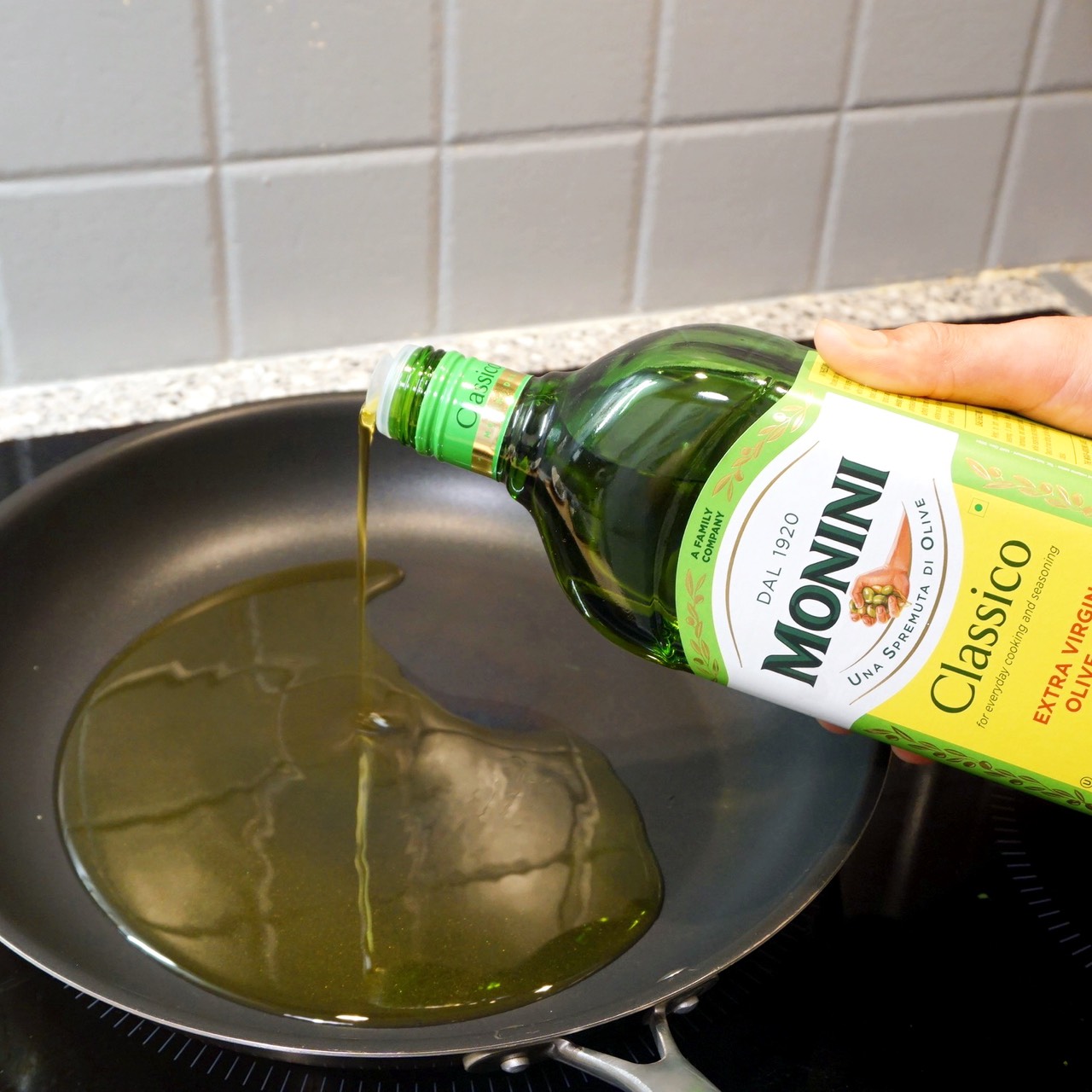 4. 中火加熱平底鍋,倒入MONINI特級初榨橄欖油 (油要多一點)