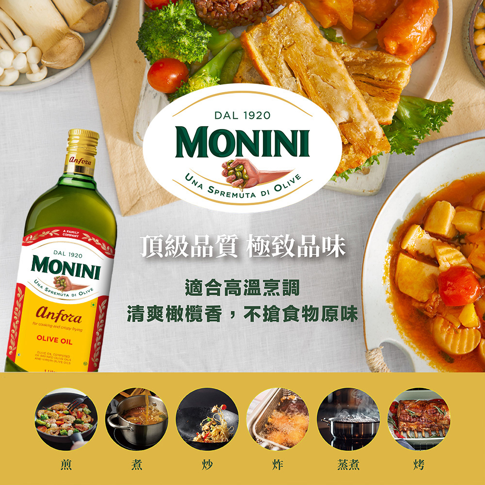 A:當然可以。橄欖油常被認為僅適合低溫烹調,但其實多數的橄欖油發煙點達180℃以上,莫尼尼純橄欖油發煙點210℃。熱炒的溫度約在120℃,油炸溫度至多也約為180℃,只要非長時間的反覆油炸,用來日常的炒菜、煎魚、炸物、烘焙都是沒有問題的。