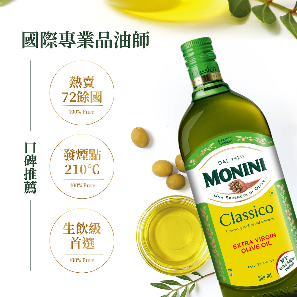 1950年,莫尼尼首推第一款的瓶裝橄欖油上市。至今,莫尼尼橄欖油在全球72國熱賣。根據Nielsen數據顯示,莫尼尼的特級初榨橄欖油是義大利、瑞士、奧地利、波蘭市佔率的第一名!