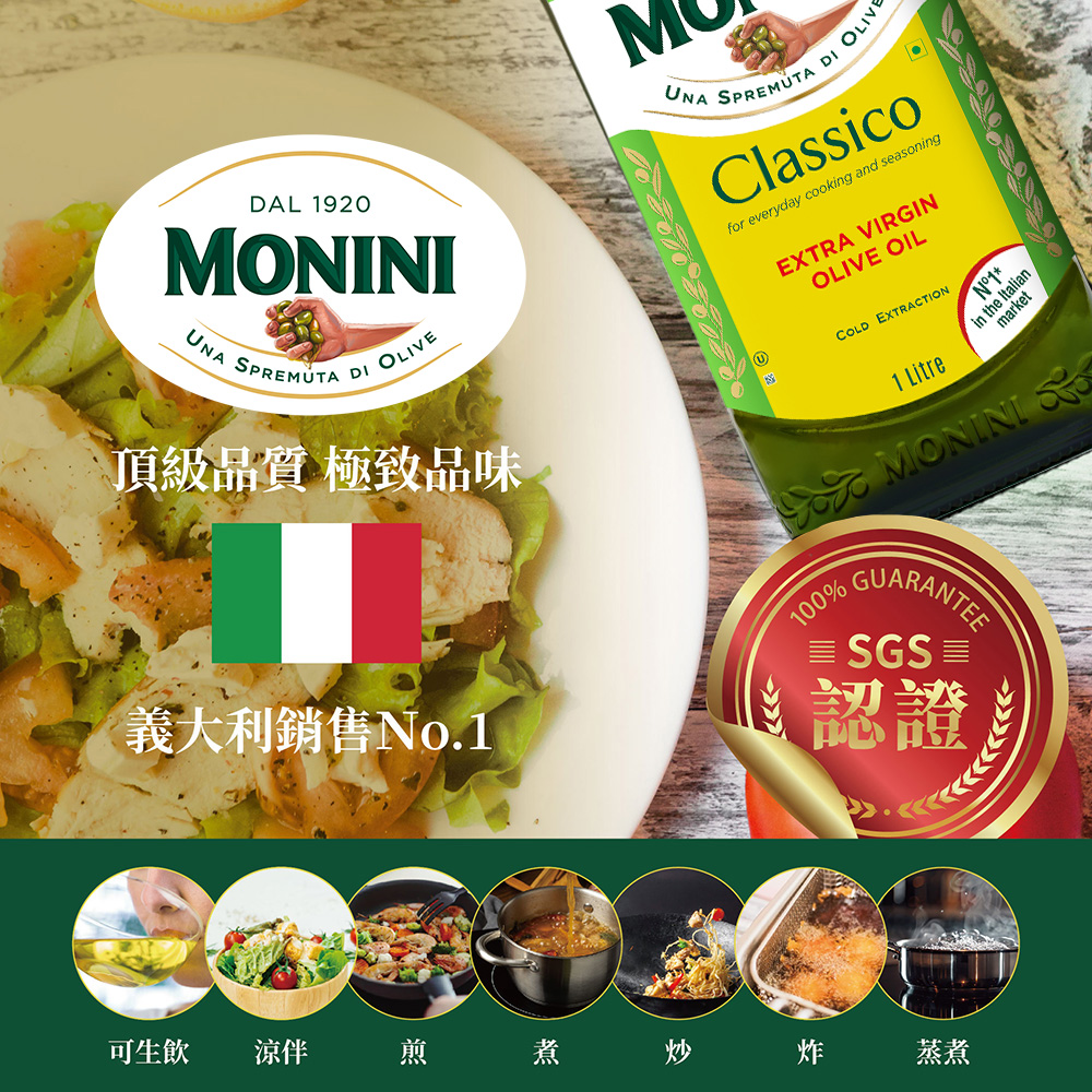 1950年,莫尼尼首推第一款的瓶裝橄欖油上市。至今,莫尼尼橄欖油在全球72國熱賣。根據Nielsen數據顯示,莫尼尼的特級初榨橄欖油是義大利、瑞士、奧地利、波蘭市佔率的第一名!